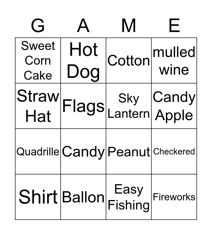 This bingo card has a free space and 25 words: Tents, Corn, Candy Apple, Pop Corn, Straw Hat, Sweet Corn Cake, Flags, Hot Dog, Ballon, Ring Toss, Quadrille, Fireworks, Peanut, Rice Pudding, Sky Lantern, Square Dancing, Easy Fishing, Cotton, Candy, Checkered, Shirt, BondFire, Barbecue, mulled wine and Ballon.