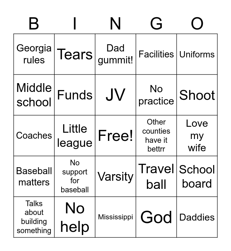 This bingo card has a free space and 24 words: No support for baseball, No help, JV, Talks about building something, Uniforms, Georgia rules, Middle school, Tears, Other counties have it bettrr, Varsity, No practice, Coaches, Travel ball, School board, Funds, God, Love my wife, Dad gummit!, Shoot, Little league, Daddies, Baseball matters, Facilities and Mississippi.