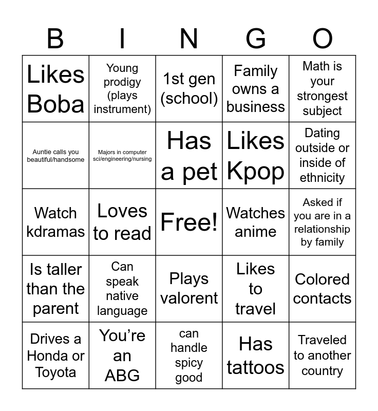 This bingo card has a free space and 25 words: Is taller than the parent, You’re an ABG, can handle spicy good, Has tattoos, Math is your strongest subject, Likes Boba, Young prodigy (plays instrument), 1st gen (school), Watches anime, Colored contacts, Auntie calls you beautiful/handsome, Majors in computer sci/engineering/nursing, FREE SPACE, Likes to travel, Dating outside or inside of ethnicity, Drives a Honda or Toyota, Loves to read, Has a pet, Likes Kpop, Asked if you are in a relationship by family, Watch kdramas, Can speak native language, Plays valorent, Family owns a business and Traveled to another country.
