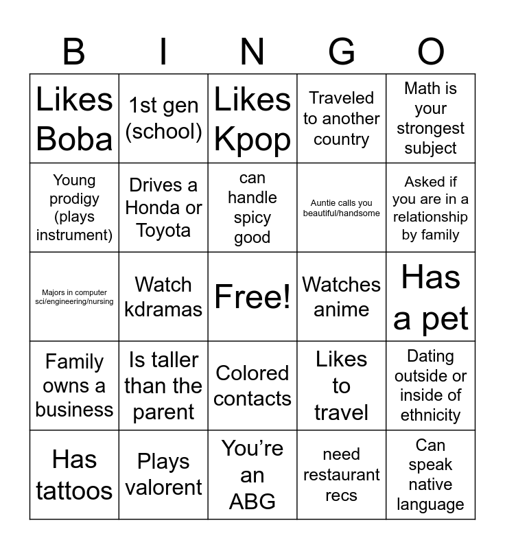 This bingo card has a free space and 25 words: Is taller than the parent, You’re an ABG, can handle spicy good, Has tattoos, Math is your strongest subject, Likes Boba, Young prodigy (plays instrument), 1st gen (school), Watches anime, Colored contacts, Auntie calls you beautiful/handsome, Majors in computer sci/engineering/nursing, Likes to travel, Dating outside or inside of ethnicity, Drives a Honda or Toyota, Loves to read, Has a pet, Likes Kpop, Asked if you are in a relationship by family, Watch kdramas, Can speak native language, Plays valorent, Family owns a business, Traveled to another country and need restaurant recs.