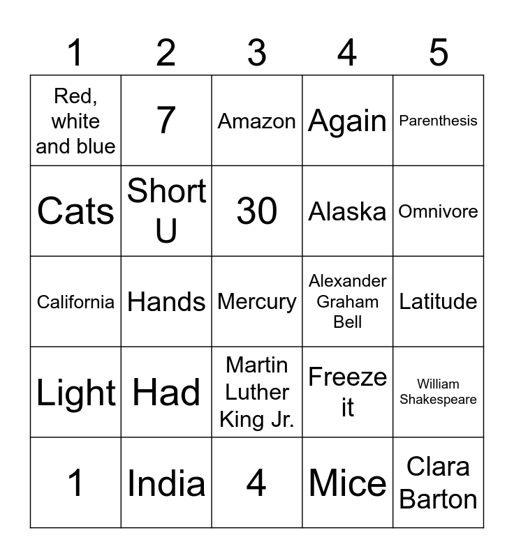 This bingo card has 30 words: 1, 28, 30, 180 degrees, Parenthesis, Red, white and blue, 7, Martin Luther King Jr., Alexander Graham Bell, Clara Barton, Light, Short U, Children, Mice, William Shakespeare, Butterfly, Hands, Mercury, Freeze it, Omnivore, California, India, Amazon, Alaska, Latitude, Cats, Had, 4, Again and Slid.