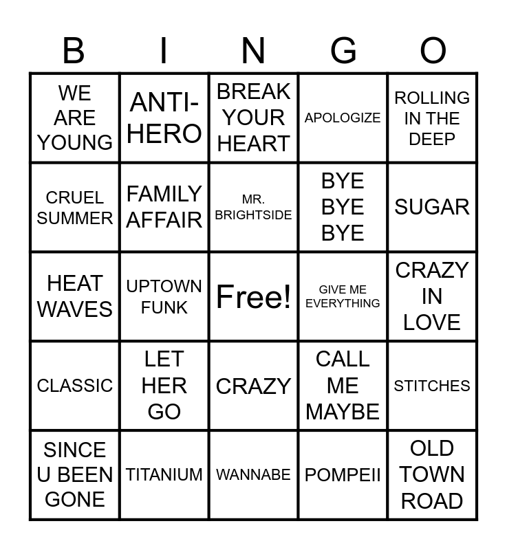 This bingo card has a free space and 75 words: THUNDER, SHUT UP AND DANCE, BREAK YOUR HEART, TIMBER, MEANT TO BE, LOVE SONG, STRONGER (WHAT DOESN’T KILL YOU), BLINDING LIGHTS, AS IT WAS, STAY, FLOWERS, SHAPE OF YOU, MR. BRIGHTSIDE, CRUEL SUMMER, FALLIN’, UPTOWN FUNK, HEY YA!, OLD TOWN ROAD, UMBRELLA, ROLLING IN THE DEEP, PARTY ROCK ANTHEM, HEAT WAVES, FAMILY AFFAIR, ANTI-HERO, APOLOGIZE, I’M REAL, CIRCLES, BRING ME TO LIFE, SMOOTH, COMPLICATED, CLOSER, OOPS…I DIDN’T AGAIN, GET LUCKY, CALL ME MAYBE, SUGAR, BYE BYE BYE, SOMEBODY THAT I USED TO KNOW, TAKE ME TO CHURCH, CRAZY IN LOVE, POMPEII, 22, DANCE THE NIGHT, LIL BOO THANG, BLANK SPACE, BABY, CAKE BY THE OCEAN, SINCE U BEEN GONE, WE ARE YOUNG, WE BELONG TOGETHER, IGNITION, REHAB, CRAZY, STAY WITH ME, HOLLABACK GIRL, TEENAGE DREAM, HAPPY, STRESSED OUT, WAKE ME UP, YOU BELONG WITH ME, SWEET BUT PSYCHO, LET HER GO, ANIMAL, AIRPLANES, TIK TOK, I GOTTA FEELING, GIVE ME EVERYTHING, LIGHTS, WHAT MAKES YOU BEAUTIFUL, EVERYBODY (BACKSTREET’S BACK), STITCHES, CLASSIC, TITANIUM, A THOUSAND MILES, WANNABE and BEST DAY OF MY LIFE.