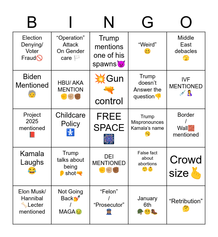 This bingo card has a free space and 24 words: Trump talks about being 👂shot🔫, Not Going Back💅 / MAGA🤢, 💥Gun🔫 control, Elon Musk/ Hannibal 🦴Lecter mentioned, Middle East debacles 🫣, Election Denying/ Voter Fraud🚫, Biden Mentioned🧓, “Operation” Attack On Gender care 🏳️, Trump Mispronounces Kamala’s name 🥱, DEI MENTIONED ✊✊🏼✊🏾, Trump doesn’t Answer the question👎, Project 2025 mentioned📕, False fact about abortions 🤥👶, Crowd size🫰, HBU/ AKA MENTION ✊✊🏼✊🏾, January 6th 🪖😵💫🥾, Border / Wall🧱 mentioned, Trump mentions one of his spawns👿, IVF MENTIONED 💉🤱, Childcare Policy 🚼, “Retribution” 🤔, Kamala Laughs 😂, “Weird” 🥴 and “Felon” / “Prosecutor” 👮🏽♀️.