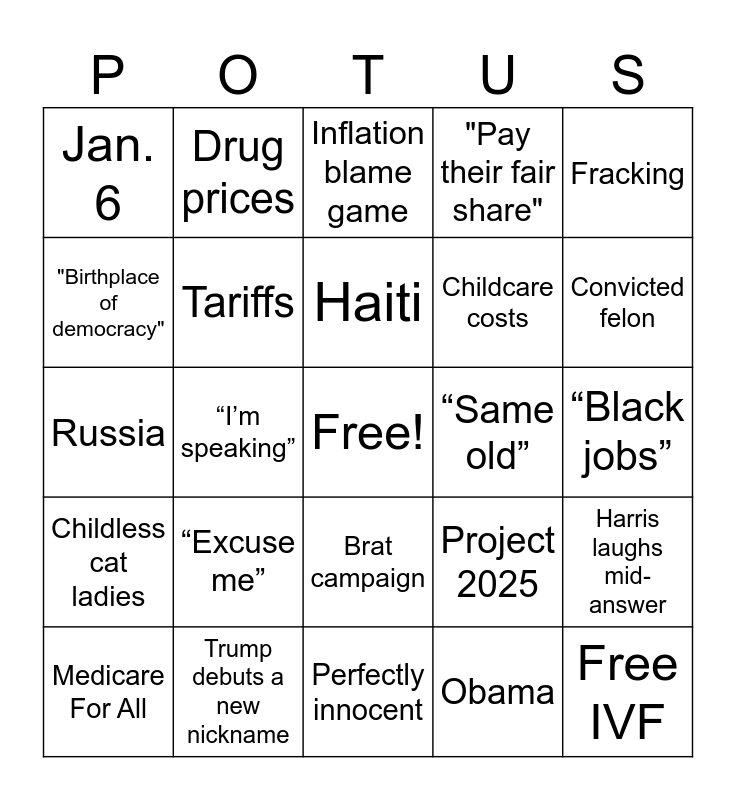 This bingo card has a free space and 30 words: Trump debuts a new nickname, Hunter Biden, “I’m speaking”, “Weird”, Jan. 6, Inflation blame game, Tariffs, Brat campaign, “Same old”, Perfectly innocent, “Black jobs”, Free IVF, Obama, Mods accused of being unfair, Convicted felon, Roe v. Wade, Project 2025, Childless cat ladies, “Excuse me”, Fracking, Russia, Cheney, Drug prices, Childcare costs, "Birthplace of democracy", "Pay their fair share", Harris laughs mid-answer, Medicare For All, Haiti and "Finish the job".