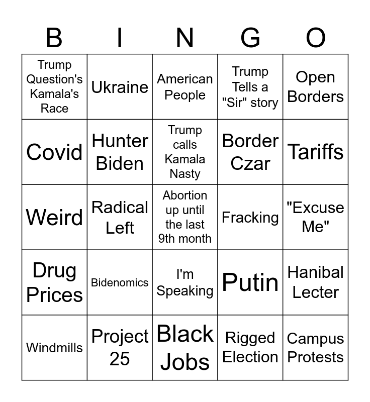 This bingo card has 40 words: January 6th, Weird, Fake News, Hunter Biden, Project 25, I'm Speaking, Trump calls Kamala Nasty, Fauci, Open Borders, Drug Prices, Radical Left, Trump Tells a "Sir" story, Abortion up until the last 9th month, "Excuse Me", Fracking, Bidenomics, Russia,Russia, Russia, Trump Question's Kamala's Race, Migrant Caravan, American People, Hanibal Lecter, Rigged Election, Border Czar, Covid, Pelosi, DEI, San Fransisco, Critical Race Theory, Campus Protests, Cost of Bacon, Second Amendment, Windmills, Electric Cars, Putin, Tariffs, Black Jobs, China, Palestine, Ukraine and Georgia.
