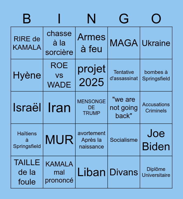 This bingo card has a free space and 54 words: BLACK JOBS, MUR, VOL DES ELECTIONS, Childless Cat Lady, Accusations Criminels, RACE de KAMALA, ROE vs WADE, 6 jan, MAGA, Tampon Tim, RIRE de KAMALA, "WEIRD", Divans, Joe Biden, FAKE NEWS, Mouche dans le studio, projet 2025, Tentative d'assassinat, IMMIGRATION, TAILLE de la foule, KAMALA mal prononcé, Liban, "we are not going back", Ukraine, CHINE, chasse à la sorcière, avortement Après la naissance, test Cognitif, Critiques Médias, RACISTE, WOKE, LGBTQ, Vétérants, Hillbillies, Hyène, Chats & Chiens, Armes à feu, Socialisme, Diplôme Universitaire, Israël, Hamas ou Hezbollah, Communiste, Transition dans les écoles, Fact Check d'un modo, Forces Armées, Walz parle de son fils, Vance parle de son chien, Bannir des livres, bombes à Springsfield, Haïtiens à Springsfield, Iran, Inflation, Prix des maisons and Football.