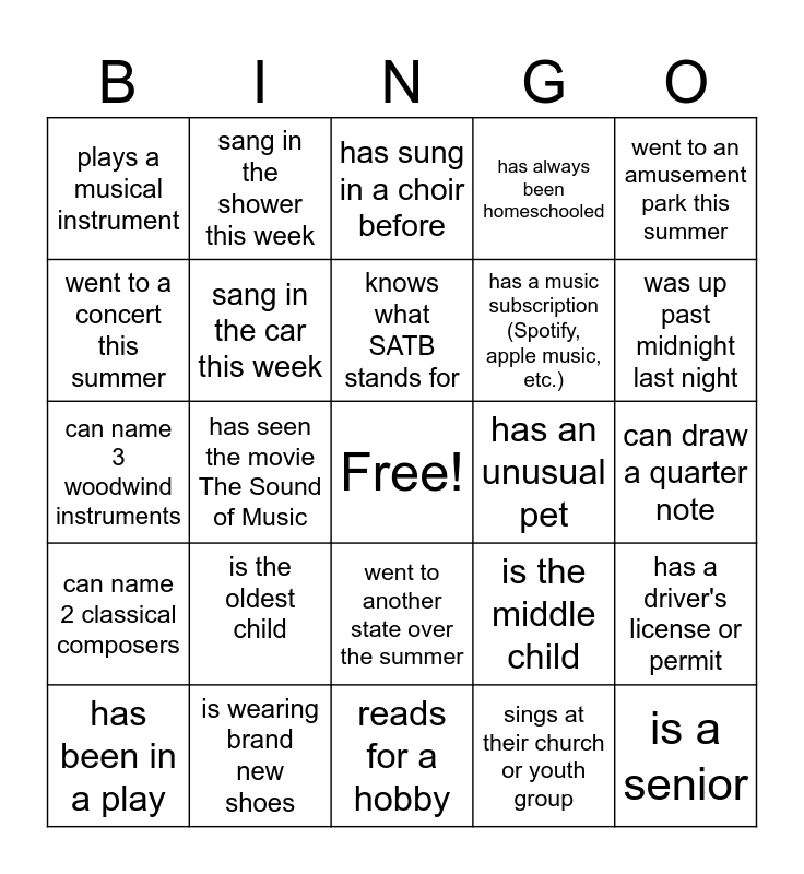 This bingo card has a free space and 26 words: went to another state over the summer, sings at their church or youth group, knows what SATB stands for, is wearing brand new shoes, went to an amusement park this summer, plays a musical instrument, went to a concert this summer, sang in the shower this week, can draw a quarter note, is the middle child, has a music subscription (Spotify, apple music, etc.), can name 3 woodwind instruments, has a driver's license or permit, has been in a play, has seen the movie The Sound of Music, swam in a lake this summer, has always been homeschooled, can name 2 classical composers, has sung in a choir before, is a senior, was up past midnight last night, reads for a hobby, has an unusual pet, is the oldest child, sang in the car this week and has been to a ballet performance.