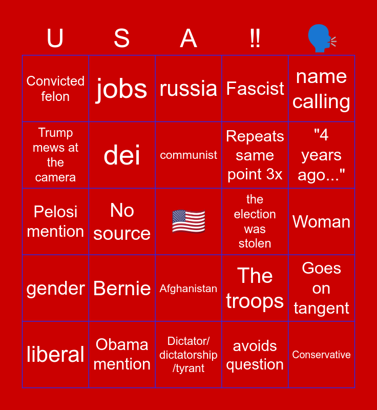This bingo card has a free space and 34 words: maga / maga varient, avoids question, "both sides", boarder/ illegal/ aliens, gender, dei, name calling, liberal, jobs, tries to interrupt the other, communist, russia, iran, israel, the election was stolen, "4 years ago...", Obama mention, Pelosi mention, Bernie, The troops, Afghanistan, Project 2025, Convicted felon, Woman, Dictator/ dictatorship /tyrant, Conservative, Fascist, Leftist, Repeats same point 3x, Trump mews at the camera, Personal attack, No source, Goes on tangent and Biden.