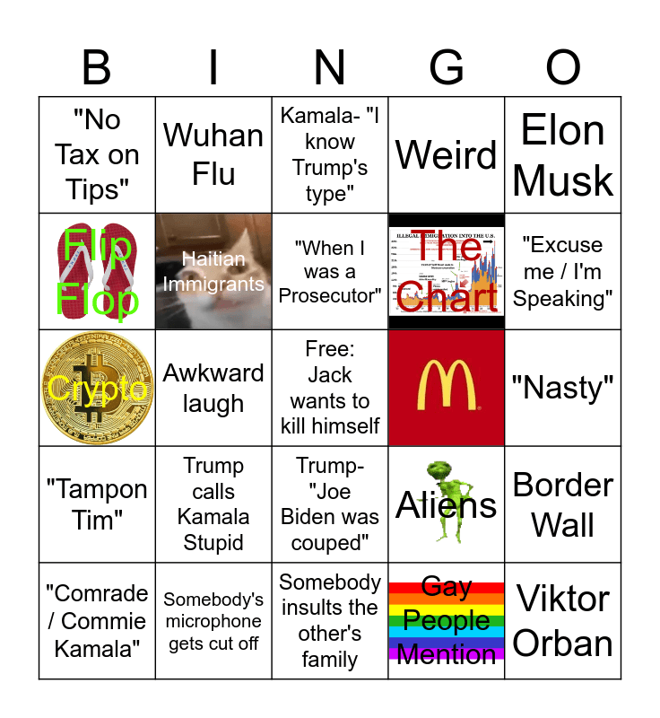 This bingo card has 8 images, a free space and 24 words: Trump calls Kamala Stupid, Somebody insults the other's family, "When I was a Prosecutor", "Comrade / Commie Kamala", Elon Musk, "No Tax on Tips", Flip Flop, Wuhan Flu, Trump- "Joe Biden was couped", The Chart, Crypto, Aliens, Border Wall, Haitian Immigrants, Cheney, "Nasty", Kamala- "I know Trump's type", "Excuse me / I'm Speaking", Awkward laugh, Viktor Orban, Somebody's microphone gets cut off, "Tampon Tim", Weird and Gay People Mention.