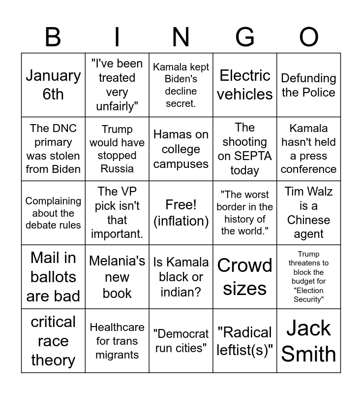 This bingo card has a free space and 24 words: Melania's new book, Healthcare for trans migrants, Hamas on college campuses, critical race theory, Defunding the Police, January 6th, The DNC primary was stolen from Biden, "I've been treated very unfairly", "The worst border in the history of the world.", Is Kamala black or indian?, The shooting on SEPTA today, Complaining about the debate rules, Crowd sizes, Trump threatens to block the budget for "Election Security", Trump would have stopped Russia, "Radical leftist(s)", Tim Walz is a Chinese agent, Kamala kept Biden's decline secret., Kamala hasn't held a press conference, The VP pick isn't that important., Jack Smith, Mail in ballots are bad, Electric vehicles and "Democrat run cities".