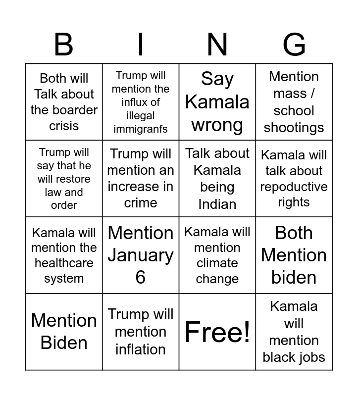 This bingo card has 17 words: Free!, Mention Biden, Say Kamala wrong, Both will Talk about the boarder crisis, Mention January 6, Mention mass / school shootings, Both Mention biden, Talk about Kamala being Indian, Kamala will talk about repoductive rights, Trump will mention an increase in crime, Trump will mention inflation, Kamala will mention climate change, Trump will say that he will restore law and order, Trump will mention the influx of illegal immigranfs, Kamala will mention the healthcare system, Trump will say America first and Kamala will mention black jobs.