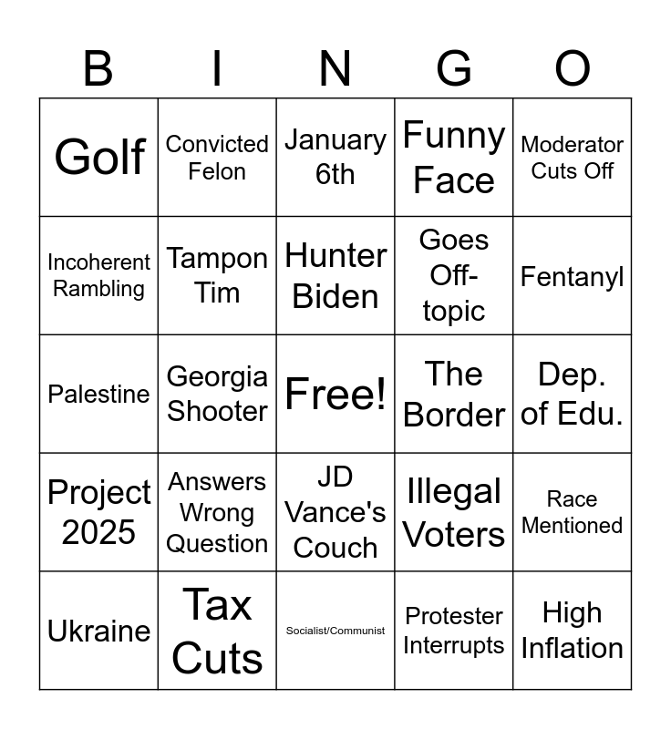 This bingo card has a free space and 32 words: Protester Interrupts, Miss-pronounced Name, Georgia Shooter, Low Inflation, Project 2025, Tampon Tim, Moderator Cuts Off, Race Mentioned, Convicted Felon, Biden, Hunter Biden, January 6th, Debating Someone Off-stage, WWIII, The Border, Brat, Ukraine, Palestine, JD Vance's Couch, Answers Wrong Question, Illegal Voters, Shouting While Muted, Dep. of Edu., Tax Cuts, High Inflation, Funny Face, Goes Off-topic, Incoherent Rambling, Golf, Socialist/Communist, Wall and Fentanyl.
