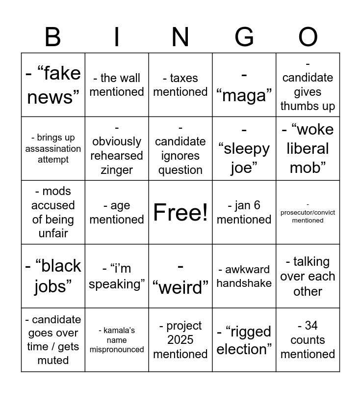 This bingo card has a free space and 24 words: - “i’m speaking”, - kamala’s name mispronounced, - candidate ignores question, - candidate goes over time / gets muted, - candidate gives thumbs up, - “fake news”, - brings up assassination attempt, - the wall mentioned, - jan 6 mentioned, - “weird”, - “sleepy joe”, - mods accused of being unfair, - awkward handshake, - talking over each other, - obviously rehearsed zinger, - “rigged election”, - prosecutor/convict mentioned, - taxes mentioned, - “woke liberal mob”, - age mentioned, - 34 counts mentioned, - “black jobs”, - “maga” and - project 2025 mentioned.