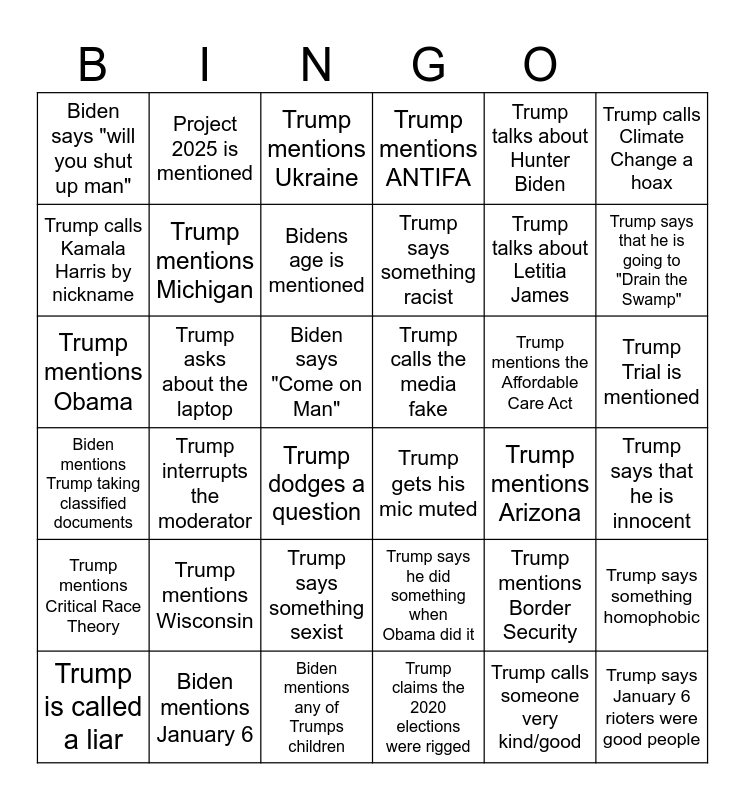 This bingo card has 70 words: Trump calls Biden "Sleepy Joe", Biden says "Come on Man", Trump is called a felon, Trump claims the 2020 elections were rigged, Trump gets his mic muted, Trump mentions BLM, Trump mentions ANTIFA, Trump blames Biden for COVID, Trump talks about Hunter Biden, Fauci is mentioned, Trump interrupts the moderator, Trump goes over time, Biden says "will you shut up man", Trump mentions Ukraine, Biden mentions Putin, Trump says that he is going to "Drain the Swamp", Trump Trial is mentioned, Bidens age is mentioned, Trump Talks/Free!, Trump calls the media fake, Trump asks about the laptop, Biden mentions Trump taking classified documents, Trump says something racist, Trump says something sexist, Trump says something homophobic, Trump says he supports the LGBTQ+, Trump says that he loves black people, Trump says that his trial was a scam made by Democrats, Trump says that he is innocent, Trump says that Democrats are attacking him, Project 2025 is mentioned, Biden mentions how Pence isn't supporting Trump, Biden mentions how he created a cabinet that reflects America, Biden touts Republicans supporting him, Biden mentions any of Trumps children, Biden mentions January 6, Trump mentions poll numbers, Biden asks about Trumps running mate, Trump mentions Border Security, Trump calls Climate Change a hoax, Trump mentions Critical Race Theory, Trump mentions the Affordable Care Act, Trump mentions Obama, Trump mentions Clinton, Trump tells a blatant lie, Trump calls Kamala Harris by nickname, Trump dodges a question, Trump calls someone very kind/good, Trump says January 6 was done by Democrats, Trump says January 6 rioters were good people, Trump smears former Republican rivals, Trump interrupts Biden, Trump says he did something when Obama did it, Trump is called a liar, Trump mentions Arizona, Trump mentions Georgia, Trump mentions Michigan, Trump mentions Nevada, Trump mentions Pennsylvania, Trump mentions Wisconsin, Trump talks about Letitia James, Trump talks about any member of the cabinet, Trump focuses on Alejandro Mayorkas, Trump says he will build a wall, Trump says he will work close with Claudia Sheinbaum, Trump can't name the new President of Mexico, Trump says he loves Mexicans, Trump makes up a word, Trump forgets about U.S. Territories and Trump mentions the District of Columbia.
