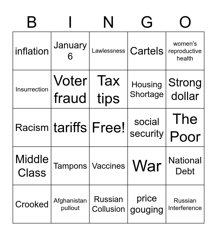 This bingo card has a free space and 52 words: Stormy Daniels, Russian Interference, Ukraine, Russian Collusion, Tampons, Stolen Election, January 6, Border Wall, Insurrection, Illegals, Voter fraud, Assassination attempt, National Debt, War, President Zolinsky, Communism, Tax tips, social security, abortion, women's reproductive health, tariffs, price gouging, inflation, Housing Shortage, Trade Deficit, Guns, Gun control, Interest rates, Strong dollar, Weak Dollar, Gun confiscation, Cartels, Big Pharma, Thugs, Illegals murdering innocent Americans, Lawlessness, Afghanistan pullout, Joy, Make America Great Again, MAHA, The forgotten, The Poor, Middle Class, Greedy Corporations, Vaccines, Health, Georgia, Racism, Dominion, Unemployment, Crooked and Felonies.