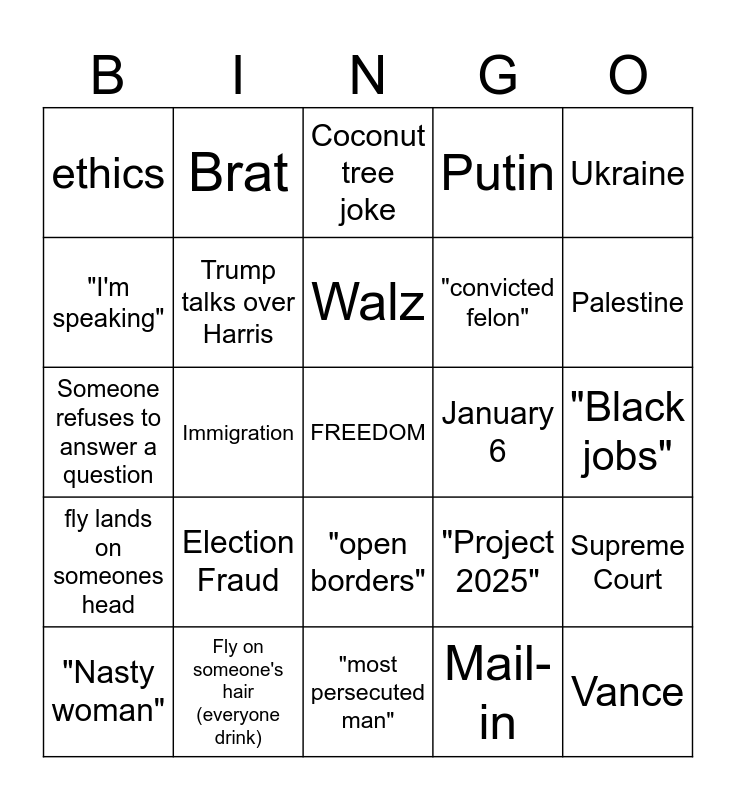 This bingo card has a free space and 51 words: Horrible, Election Fraud, Drop-boxes, Mail-in, Palestine, NATO, Brat, Harris calls Trump weird, "convicted felon", Vance, Someone refuses to answer a question, Trump talks over Harris, "Project 2025", "Black jobs", "you exist in the context", Biden, Coconut tree joke, January 6, Mic shuts off mid-sentence, "I'm speaking", Immigration, "Comrade", Putin, Ukraine, "climate change", Israel, Walz, "Gaza Strip"/Hamas, Supreme Court, ethics, Fentanyl, "gun rights", Patriotism, Artificial Intelligence or AI, Tremendous, "massive fraud", Impeachment, "fake news", "climate 'hoax'", Trump talks/yells after his mic is muted, Fly on someone's hair (everyone drink), "open borders", Harris says "we won't go back" 3 times, Trump misprounces Kamala, "Nasty woman", Trump calls debate rigged, "most persecuted man", "the swamp", an audible fart, fly lands on someones head and "deep state".