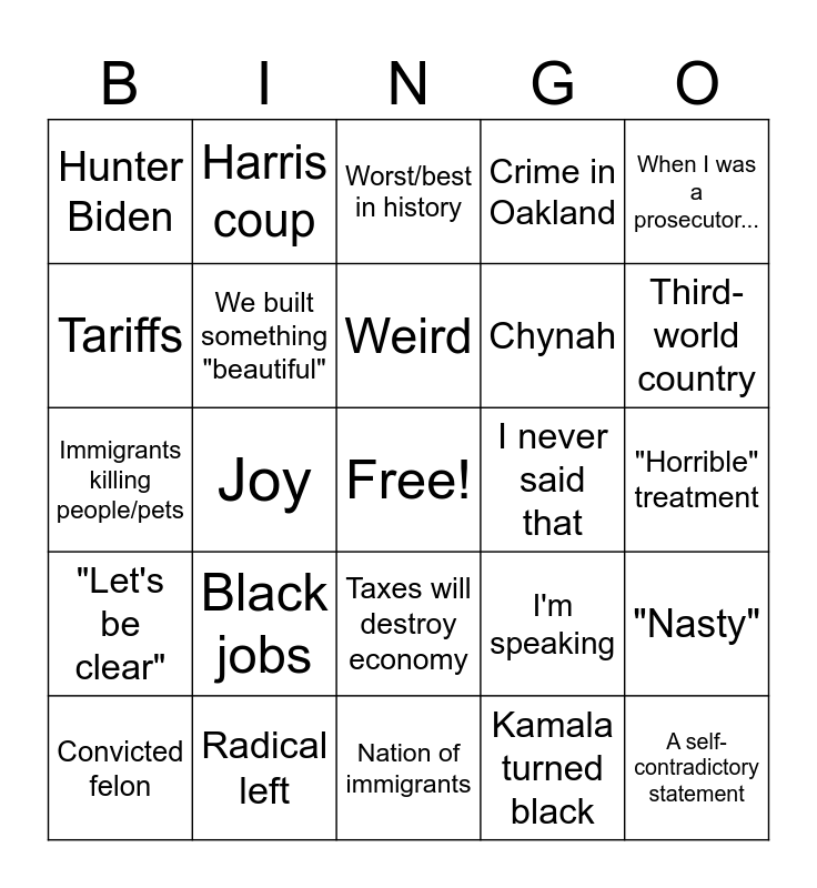 This bingo card has a free space and 24 words: Black jobs, Radical left, Weird, Convicted felon, When I was a prosecutor..., Hunter Biden, Tariffs, Harris coup, I never said that, Taxes will destroy economy, Chynah, Immigrants killing people/pets, I'm speaking, "Nasty", We built something "beautiful", Kamala turned black, "Horrible" treatment, Worst/best in history, Third-world country, Joy, A self-contradictory statement, "Let's be clear", Crime in Oakland and Nation of immigrants.