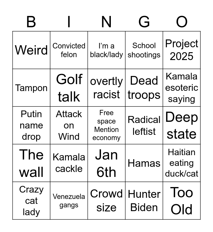 This bingo card has a free space and 24 words: Kamala cackle, Venezuela gangs, overtly racist, Crazy cat lady, Project 2025, Weird, Tampon, Convicted felon, Radical leftist, Jan 6th, Dead troops, Putin name drop, Hamas, Haitian eating duck/cat, Golf talk, Hunter Biden, Deep state, I’m a black/lady, Kamala esoteric saying, Attack on Wind, Too Old, The wall, School shootings and Crowd size.