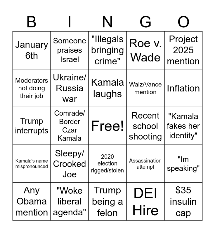 This bingo card has a free space and 24 words: Sleepy/ Crooked Joe, "Woke liberal agenda", Kamala laughs, Any Obama mention, Project 2025 mention, January 6th, Moderators not doing their job, Someone praises Israel, Recent school shooting, 2020 election rigged/stolen, Walz/Vance mention, Trump interrupts, Assassination attempt, "Im speaking", Ukraine/ Russia war, DEI Hire, "Kamala fakes her identity", "Illegals bringing crime", Inflation, Comrade/ Border Czar Kamala, $35 insulin cap, Kamala's name mispronounced, Roe v. Wade and Trump being a felon.