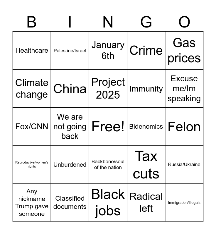 This bingo card has a free space and 37 words: Inflation, Student loans, Border, China, Russia/Ukraine, Unburdened, Project 2025, Groceries, Gas prices, MAGA, We are not going back, Crime, Immigration/Illegals, Felon, Climate change, Reproductive/women’s rights, Election interference, January 6th, Backbone/soul of the nation, Bidenomics, Healthcare, Excuse me/Im speaking, Any nickname Trump gave someone, Black jobs, Weird, Radical left, Palestine/Israel, Felon, Gun control, 9/11, SCOTUS, Classified documents, Fox/CNN, Reference to age, Tax cuts, Immunity and Any mention of a VP.