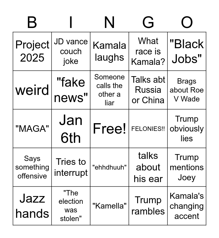 This bingo card has a free space and 24 words: Jazz hands, Tries to interrupt, Someone calls the other a liar, Trump rambles, "Black Jobs", Project 2025, JD vance couch joke, Kamala laughs, FELONIES!!, Trump obviously lies, "MAGA", "fake news", talks about his ear, Trump mentions Joey, weird, "The election was stolen", "Kamella", What race is Kamala?, Brags about Roe V Wade, Says something offensive, Jan 6th, "ehhdhuuh", Talks abt Russia or China and Kamala's changing accent.