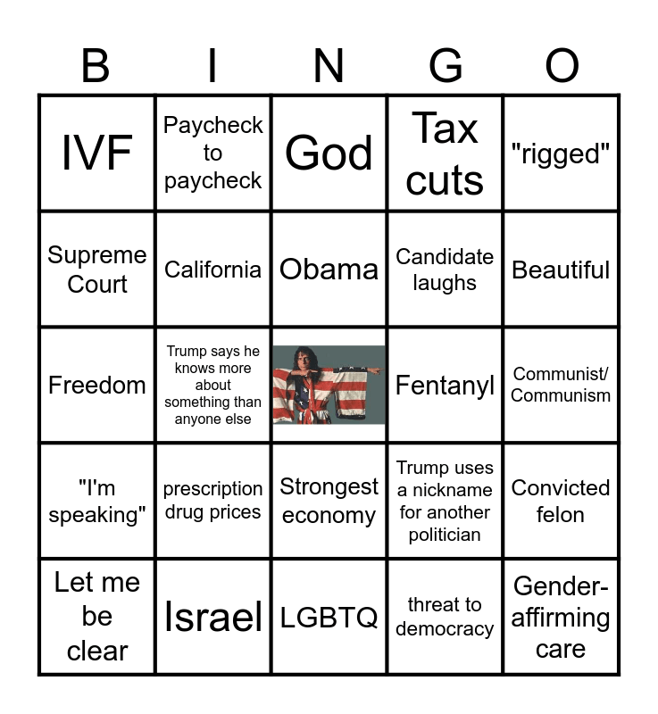 This bingo card has a free space and 54 words: Infrastructure, "I'm speaking", China, Unions, Strongest economy, Law and order, Tax cuts, Electric cars, Supreme Court, Christian, IVF, Ceasefire, Israel, Let me be clear, Women, LGBTQ, Gender-affirming care, Candidate laughs, Very fine people, Communist/ Communism, Trump uses a nickname for another politician, Kamala says “Excuse me”, Fentanyl, "rigged", COVID, Paycheck to paycheck, Food prices, The Middle Class, Roe vs Wade, threat to democracy, "very nasty", Middle Class, NATO, Guns, God, Childcare, Freedom, Convicted felon, climate change, California, Project 2025, Inflation, Crime, Florida, prescription drug prices, Illegal immigrants, "historic", transgender, Obama, Trump says he knows more about something than anyone else, Beautiful, January 6th, Putin and Veterans.