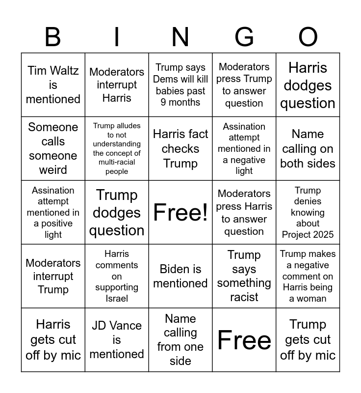 This bingo card has a free space and 25 words: Harris comments on supporting Israel, Name calling from one side, Harris fact checks Trump, Harris gets cut off by mic, Harris dodges question, Tim Waltz is mentioned, Someone calls someone weird, Moderators interrupt Harris, Moderators press Harris to answer question, Biden is mentioned, Assination attempt mentioned in a negative light, Assination attempt mentioned in a positive light, Trump says something racist, Trump makes a negative comment on Harris being a woman, Trump alludes to not understanding the concept of multi-racial people, Trump says something to the affect of “They’re taking our jobs”, Trump denies knowing about Project 2025, Trump says Dems will kill babies past 9 months, Name calling on both sides, Trump dodges question, Trump gets cut off by mic, JD Vance is mentioned, Moderators interrupt Trump, Moderators press Trump to answer question and Free.