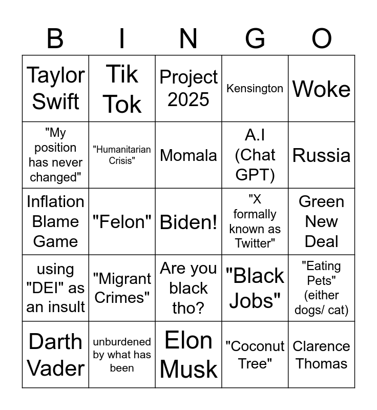 This bingo card has a free space and 24 words: "Migrant Crimes", unburdened by what has been, Momala, Darth Vader, Woke, Taylor Swift, "My position has never changed", Tik Tok, "X formally known as Twitter", Are you black tho?, A.I (Chat GPT), Inflation Blame Game, "Black Jobs", "Eating Pets" (either dogs/ cat), "Humanitarian Crisis", "Coconut Tree", Green New Deal, Project 2025, Russia, "Felon", Clarence Thomas, using "DEI" as an insult, Kensington and Elon Musk.