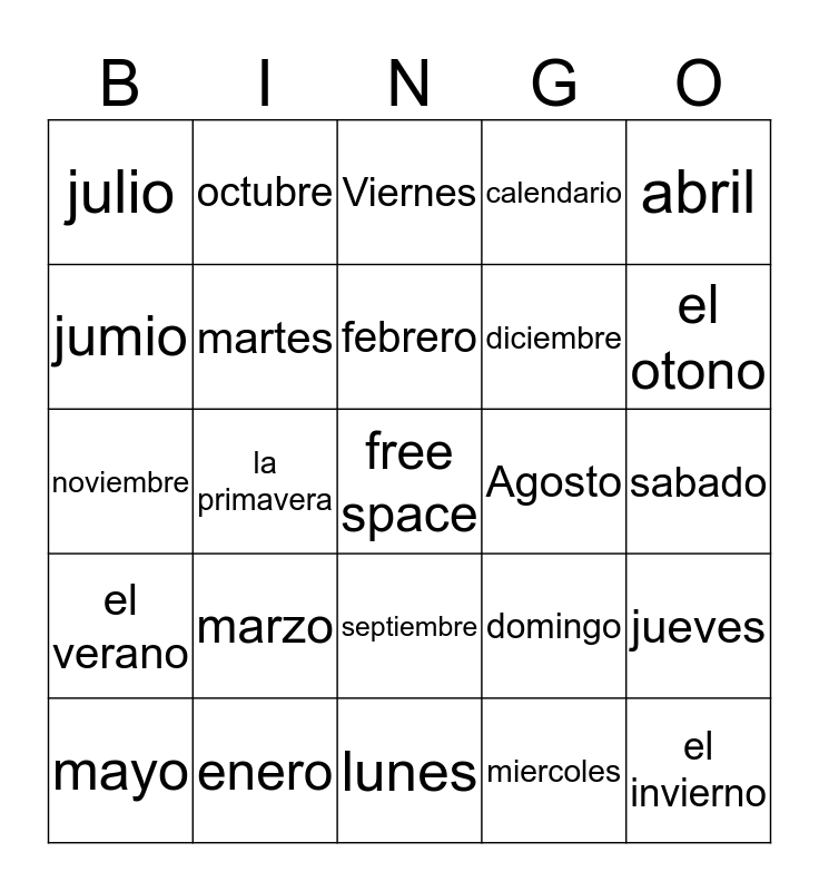 This bingo card has a free space and 24 words: marzo, enero, febrero, mayo, abril, julio, jumio, octubre, Agosto, septiembre, diciembre, noviembre, domingo, jueves, martes, miercoles, sabado, Viernes, el otono, la primavera, el invierno, el verano, calendario and lunes.
