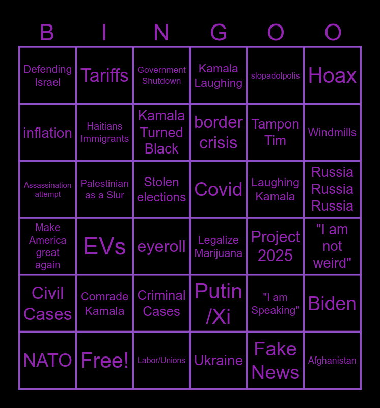 This bingo card has 42 words: Fake News, Haitians Immigrants, Fake news, Laughing Kamala, "I am not weird", EVs, Assassination attempt, Jan 6th Hostages, Government Shutdown, Russia Russia Russia, Stolen elections, border crisis, Windmills, slopadolpolis, Free!, Make America great again, Biden, Tampon Tim, Afghanistan, Tariffs, Hoax, Criminal Cases, Civil Cases, Defending Israel, Say Kamala's name wrong, NATO, Kamala Turned Black, Biden Crime, Comrade Kamala, "I am Speaking", Weird, Covid, inflation, Project 2025, Labor/Unions, eyeroll, Legalize Marijuana, Palestinian as a Slur, Putin /Xi, Ukraine, Kamala Laughing and China.