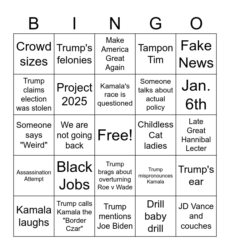 This bingo card has a free space and 24 words: Black Jobs, Trump calls Kamala the "Border Czar", Kamala's race is questioned, Kamala laughs, Fake News, Crowd sizes, Trump claims election was stolen, Trump's felonies, Childless Cat ladies, Trump brags about overturning Roe v Wade, Someone talks about actual policy, Someone says "Weird", Trump mispronounces Kamala, Trump's ear, Project 2025, Drill baby drill, Late Great Hannibal Lecter, Make America Great Again, Jan. 6th, We are not going back, JD Vance and couches, Assassination Attempt, Tampon Tim and Trump mentions Joe Biden.