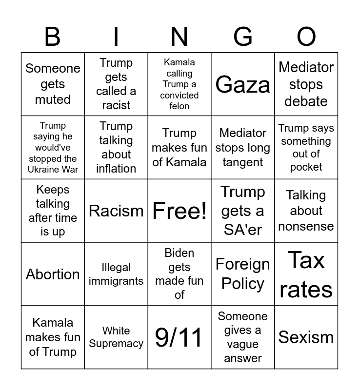This bingo card has a free space and 24 words: Illegal immigrants, White Supremacy, Trump makes fun of Kamala, Kamala makes fun of Trump, Mediator stops debate, Someone gets muted, Trump saying he would've stopped the Ukraine War, Trump gets called a racist, Trump gets a SA'er, Biden gets made fun of, Mediator stops long tangent, Keeps talking after time is up, Foreign Policy, Tax rates, Trump talking about inflation, Someone gives a vague answer, Talking about nonsense, Kamala calling Trump a convicted felon, Trump says something out of pocket, Racism, Sexism, Abortion, Gaza and 9/11.