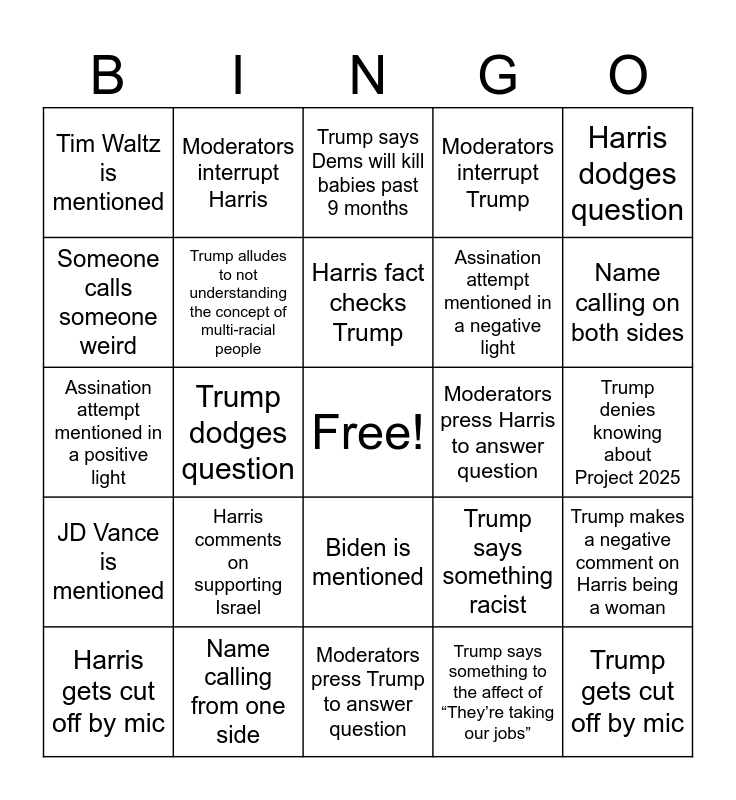 This bingo card has a free space and 24 words: Harris comments on supporting Israel, Name calling from one side, Harris fact checks Trump, Harris gets cut off by mic, Harris dodges question, Tim Waltz is mentioned, Someone calls someone weird, Moderators interrupt Harris, Moderators press Harris to answer question, Biden is mentioned, Assination attempt mentioned in a negative light, Assination attempt mentioned in a positive light, Trump says something racist, Trump makes a negative comment on Harris being a woman, Trump alludes to not understanding the concept of multi-racial people, Trump says something to the affect of “They’re taking our jobs”, Trump denies knowing about Project 2025, Trump says Dems will kill babies past 9 months, Name calling on both sides, Trump dodges question, Trump gets cut off by mic, JD Vance is mentioned, Moderators interrupt Trump and Moderators press Trump to answer question.