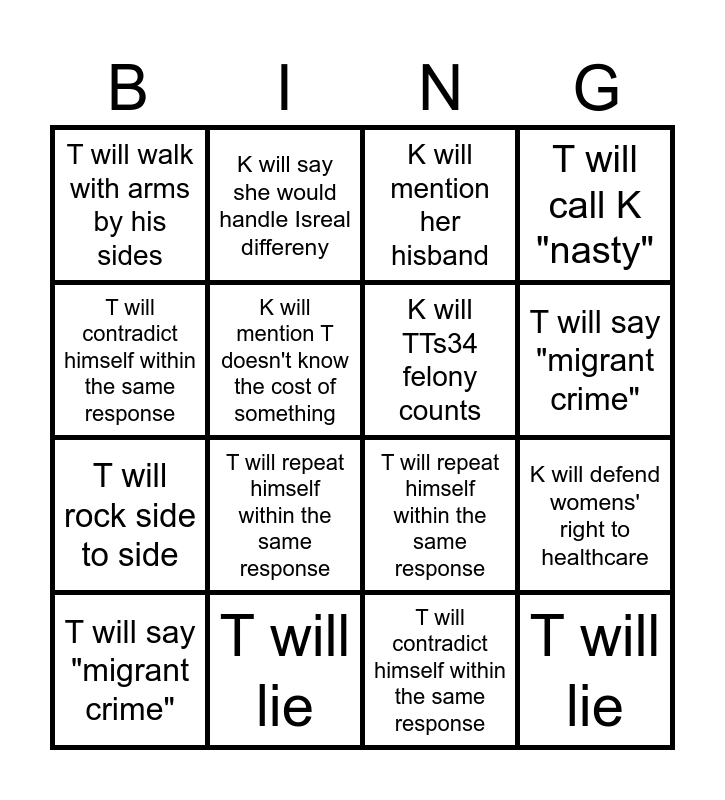 This bingo card has 16 words: T will lie, K will defend womens' right to healthcare, K will mention her hisband, T will walk with arms by his sides, T will rock side to side, K will say she would handle Isreal differeny, T will repeat himself within the same response, T will contradict himself within the same response, T will contradict himself within the same response, K will mention T doesn't know the cost of something, T will say "migrant crime", T will call K "nasty", T will repeat himself within the same response, T will say "migrant crime", K will TTs34 felony counts and T will lie.