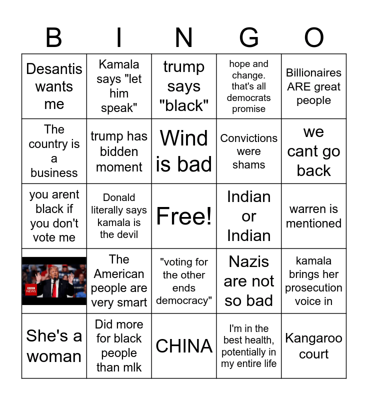 This bingo card has 1 images, a free space and 23 words: She's a woman, The American people are very smart, Wind is bad, I'm in the best health, potentially in my entire life, Billionaires ARE great people, Desantis wants me, Kamala says "let him speak", trump says "black", Indian or Indian, warren is mentioned, you arent black if you don't vote me, trump has bidden moment, Nazis are not so bad, kamala brings her prosecution voice in, The country is a business, Did more for black people than mlk, CHINA, hope and change. that's all democrats promise, we cant go back, Donald literally says kamala is the devil, "voting for the other ends democracy", Convictions were shams and Kangaroo court.