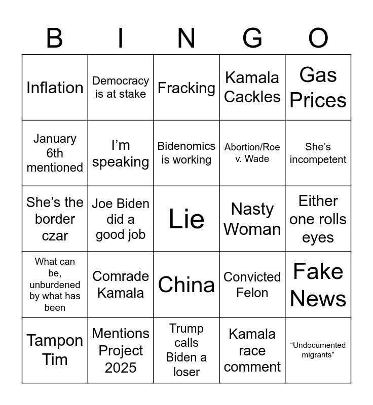 This bingo card has a free space and 24 words: Comrade Kamala, Mentions Project 2025, Bidenomics is working, Tampon Tim, Gas Prices, Inflation, January 6th mentioned, Democracy is at stake, Nasty Woman, China, Abortion/Roe v. Wade, She’s the border czar, Convicted Felon, Fake News, I’m speaking, Kamala race comment, Either one rolls eyes, Fracking, She’s incompetent, Joe Biden did a good job, “Undocumented migrants”, What can be, unburdened by what has been, Kamala Cackles and Trump calls Biden a loser.