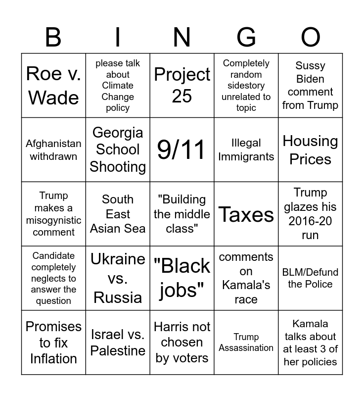 This bingo card has a free space and 24 words: Ukraine vs. Russia, Israel vs. Palestine, 9/11, Promises to fix Inflation, Sussy Biden comment from Trump, Roe v. Wade, Afghanistan withdrawn, please talk about Climate Change policy, Taxes, "Black jobs", Illegal Immigrants, Trump makes a misogynistic comment, comments on Kamala's race, BLM/Defund the Police, Georgia School Shooting, Trump Assassination, Trump glazes his 2016-20 run, Project 25, Housing Prices, South East Asian Sea, Kamala talks about at least 3 of her policies, Candidate completely neglects to answer the question, Completely random sidestory unrelated to topic and Harris not chosen by voters.