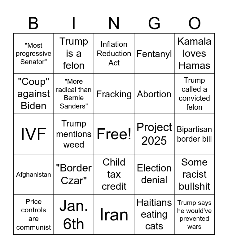 This bingo card has a free space and 24 words: "Border Czar", Jan. 6th, Fracking, Price controls are communist, Kamala loves Hamas, "Most progressive Senator", "Coup" against Biden, Trump is a felon, Project 2025, Child tax credit, Abortion, IVF, Election denial, Some racist bullshit, "More radical than Bernie Sanders", Haitians eating cats, Bipartisan border bill, Inflation Reduction Act, Trump called a convicted felon, Trump mentions weed, Trump says he would've prevented wars, Afghanistan, Fentanyl and Iran.
