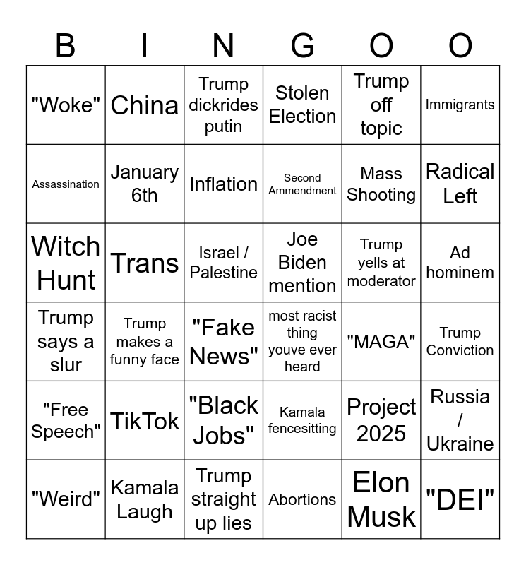 This bingo card has 39 words: Kamala Laugh, "Weird", Wall, Assassination, "Fake News", Ad hominem, January 6th, "DEI", Trump off topic, Joe Biden mention, Radical Left, Stolen Election, Witch Hunt, Israel / Palestine, Trans, Trump yells at moderator, Project 2025, "Woke", Trump straight up lies, Trump says a slur, Immigrants, "MAGA", Inflation, Second Ammendment, Abortions, "Black Jobs", "Free Speech", Elon Musk, TikTok, China, Roe V Wade, Russia / Ukraine, Trump dickrides putin, most racist thing youve ever heard, Trump Conviction, Kamala fencesitting, Trump makes a funny face, Mass Shooting and Gen Alpha slang.
