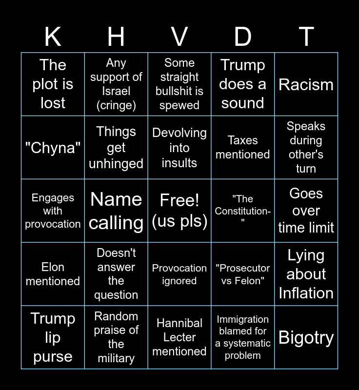This bingo card has a free space and 42 words: Moderator has to repeat the question, Devolving into insults, Incoherent sentences, Doesn't answer the question, Immigration blamed for a systematic problem, Lying about Inflation, Bigotry, Classic Kamala Laugh, Some straight bullshit is spewed, Provocation ignored, Goes over time limit, Speaks during other's turn, Name calling, Racism, Out of touch reference, "Prosecutor vs Felon", Roe v Wade Mentioned, Engages with provocation, Lying about the economy, Any support of Israel (cringe), "Chyna", "Russia Russia Russia", "I'm speaking", The plot is lost, "Weird", The Middle Class Mentioned, Taxes mentioned, WW3 mentioned, Stock Market crash mentioned, Opportunity Economy, Transphobia, Elon mentioned, Things get unhinged, Hannibal Lecter mentioned, Healthcare ignored, Trump lip purse, Random praise of the military, "The Constitution-", Yelling, Eye Rolling, Trump does a sound and One of them gets muted.