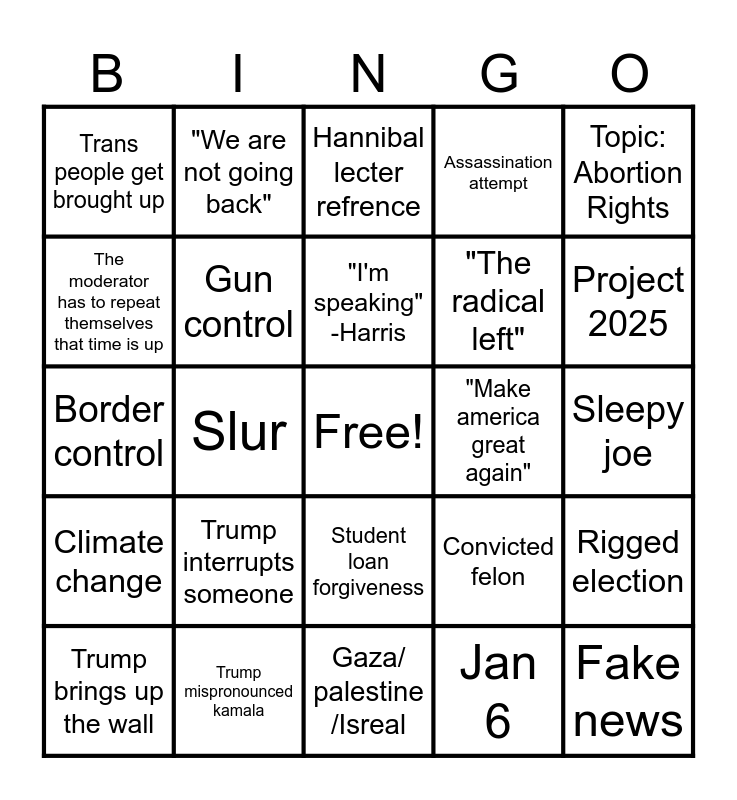 This bingo card has a free space and 24 words: Trump interrupts someone, Trump mispronounced kamala, "I'm speaking" -Harris, Trump brings up the wall, Topic: Abortion Rights, Trans people get brought up, The moderator has to repeat themselves that time is up, "We are not going back", "Make america great again", Student loan forgiveness, "The radical left", Border control, Convicted felon, Rigged election, Gun control, Jan 6, Sleepy joe, Hannibal lecter refrence, Project 2025, Slur, Fake news, Climate change, Assassination attempt and Gaza/ palestine /Isreal.