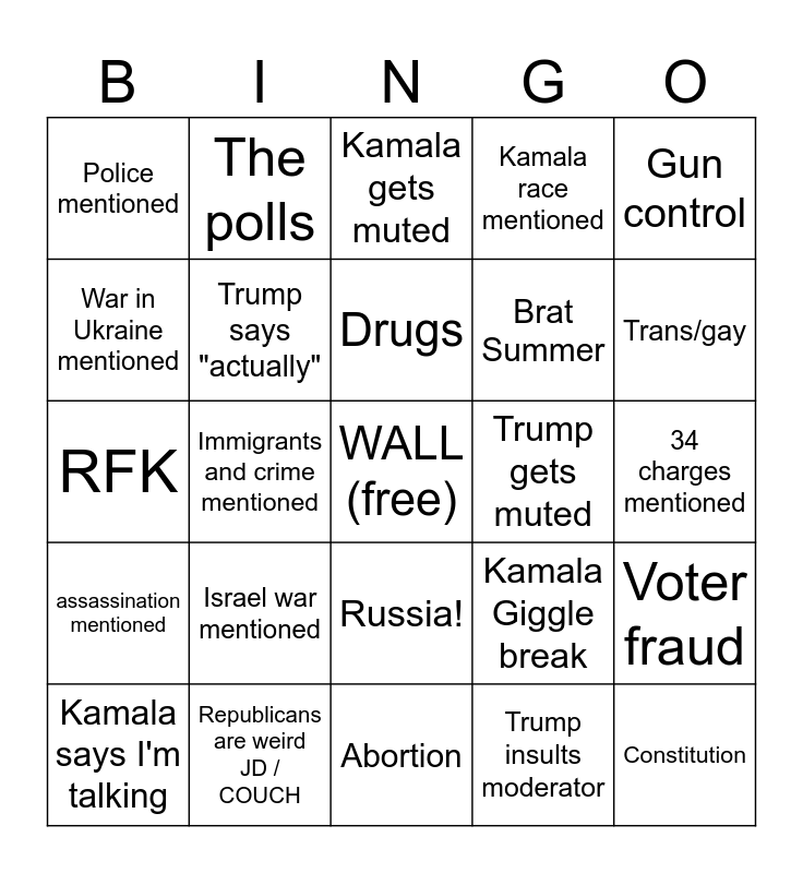 This bingo card has a free space and 24 words: Israel war mentioned, Republicans are weird JD / COUCH, Drugs, Kamala says I'm talking, Gun control, Police mentioned, War in Ukraine mentioned, The polls, Trump gets muted, Russia!, Brat Summer, RFK, Kamala Giggle break, Voter fraud, Trump says "actually", Trump insults moderator, 34 charges mentioned, Kamala gets muted, Trans/gay, Immigrants and crime mentioned, Constitution, assassination mentioned, Kamala race mentioned and Abortion.