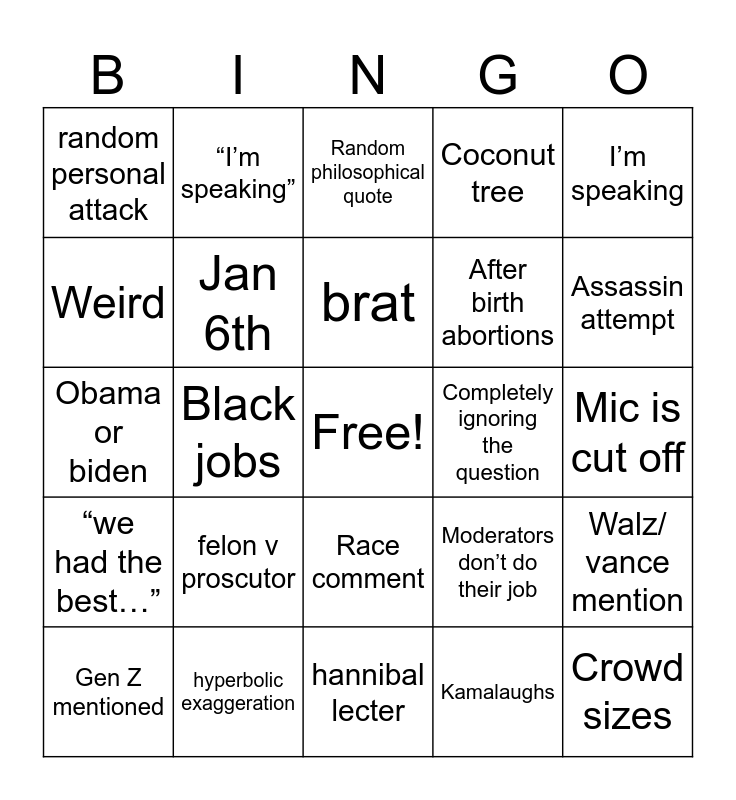 This bingo card has a free space and 24 words: felon v proscutor, hyperbolic exaggeration, brat, Gen Z mentioned, I’m speaking, random personal attack, Weird, “I’m speaking”, Completely ignoring the question, Race comment, After birth abortions, Obama or biden, Moderators don’t do their job, Walz/ vance mention, Jan 6th, Kamalaughs, Mic is cut off, Random philosophical quote, Assassin attempt, Black jobs, Crowd sizes, “we had the best…”, Coconut tree and hannibal lecter.
