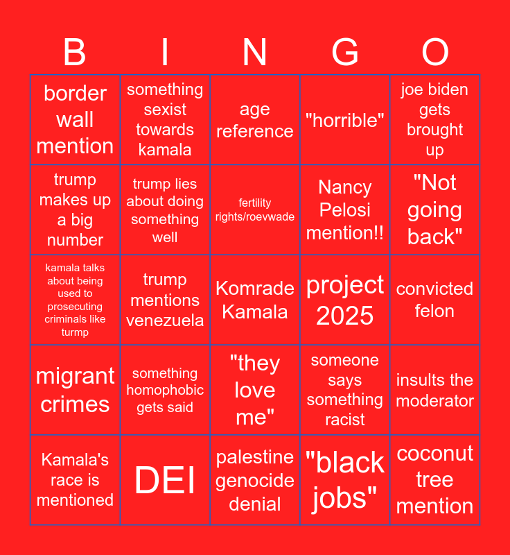 This bingo card has 25 words: something homophobic gets said, palestine genocide denial, fertility rights/roevwade, Kamala's race is mentioned, joe biden gets brought up, border wall mention, trump makes up a big number, something sexist towards kamala, project 2025, "they love me", Nancy Pelosi mention!!, kamala talks about being used to prosecuting criminals like turmp, someone says something racist, insults the moderator, trump lies about doing something well, coconut tree mention, convicted felon, age reference, "Not going back", trump mentions venezuela, Komrade Kamala, DEI, migrant crimes, "horrible" and "black jobs".