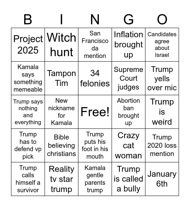 This bingo card has a free space and 24 words: Bible believing christians, Reality tv star trump, 34 felonies, Trump calls himself a survivor, Candidates agree about Israel, Project 2025, Kamala says something memeable, Witch hunt, Abortion ban brought up, Trump puts his foot in his mouth, Supreme Court judges, Trump says nothing and everything, Crazy cat woman, Trump 2020 loss mention, Tampon Tim, Trump is called a bully, Trump is weird, San Francisco da mention, Trump yells over mic, New nickname for Kamala, January 6th, Trump has to defend vp pick, Inflation brought up and Kamala gentle parents trump.