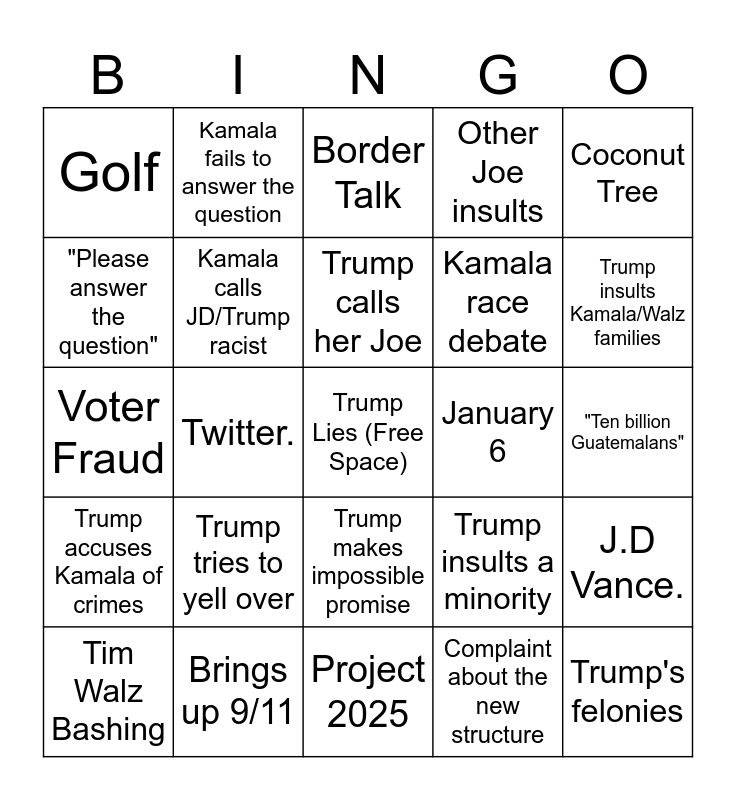 This bingo card has a free space and 24 words: Trump tries to yell over, Brings up 9/11, Trump calls her Joe, Tim Walz Bashing, Coconut Tree, Golf, "Please answer the question", Kamala fails to answer the question, January 6, Trump makes impossible promise, Kamala race debate, Voter Fraud, Trump insults a minority, J.D Vance., Kamala calls JD/Trump racist, Complaint about the new structure, "Ten billion Guatemalans", Border Talk, Trump insults Kamala/Walz families, Twitter., Trump's felonies, Trump accuses Kamala of crimes, Other Joe insults and Project 2025.