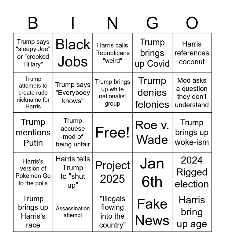 This bingo card has a free space and 24 words: Harris tells Trump to "shut up", Assassination attempt, Trump brings up white nationalist group, Trump brings up Harris's race, Harris references coconut, Trump says "sleepy Joe" or "crooked Hillary", Trump attempts to create rude nickname for Harris, Black Jobs, Roe v. Wade, Project 2025, Trump denies felonies, Trump mentions Putin, Jan 6th, 2024 Rigged election, Trump says "Everybody knows", Fake News, Trump brings up woke-ism, Harris calls Republicans "weird", Mod asks a question they don't understand, Trump accuese mod of being unfair, Harris bring up age, Harris's version of Pokemon Go to the polls, Trump brings up Covid and "Illegals flowing into the country".