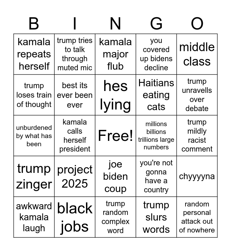 This bingo card has a free space and 24 words: project 2025, black jobs, hes lying, awkward kamala laugh, middle class, kamala repeats herself, trump loses train of thought, trump tries to talk through muted mic, millions billions trillions large numbers, joe biden coup, Haitians eating cats, unburdened by what has been, you're not gonna have a country, chyyyyna, best its ever been ever, trump slurs words, trump mildly racist comment, kamala major flub, trump unravells over debate, kamala calls herself president, random personal attack out of nowhere, trump zinger, you covered up bidens decline and trump random complex word.