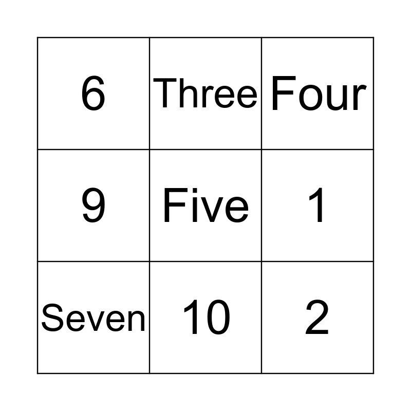 This bingo card has a free space and 8 words: 1, Four, Three, Seven, 6, 2, 9 and 10.