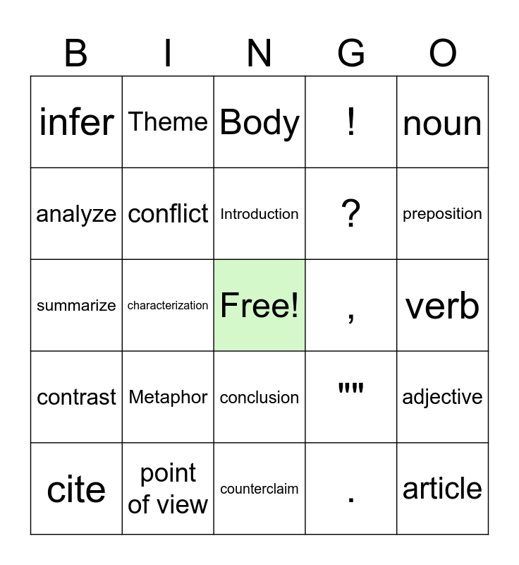 This bingo card has a free space and 24 words: cite, Metaphor, Introduction, ., noun, infer, Theme, Body, ,, verb, summarize, conflict, "", adjective, analyze, point of view, counterclaim, !, preposition, contrast, characterization, conclusion, ? and article.